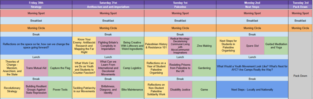 In 2024 our gathering was held in a park near Manchester, from 26th July-3rd September. The timetable looked like this: