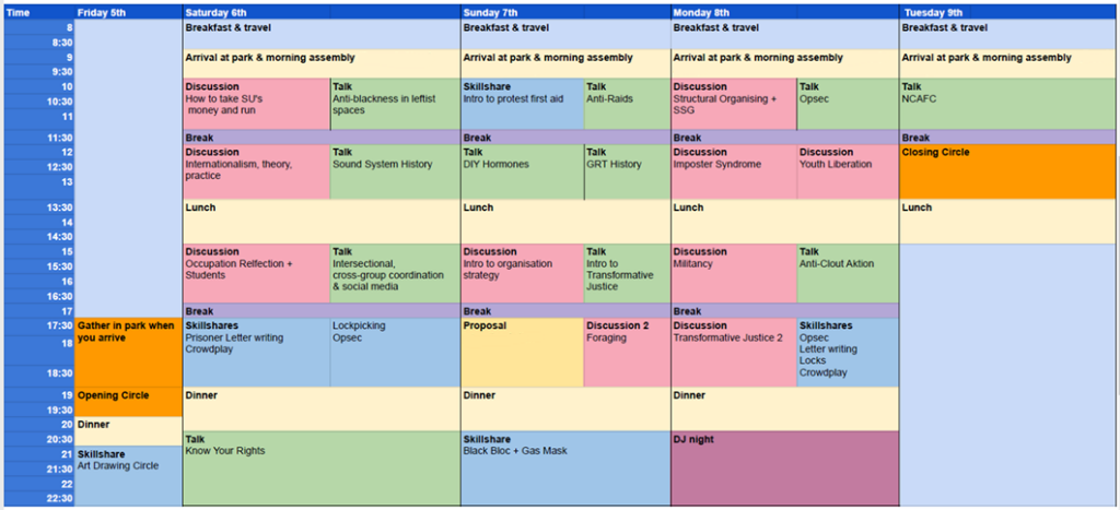 We brought together around 60-70 young people and students to a 4-day event in Sheffield. People slept in houses and campsites around the city, and all converged on Endcliffe Park in the morning to set up some gazebos and create our autonomous space. We had two streams of workshops, with lots of great sessions.