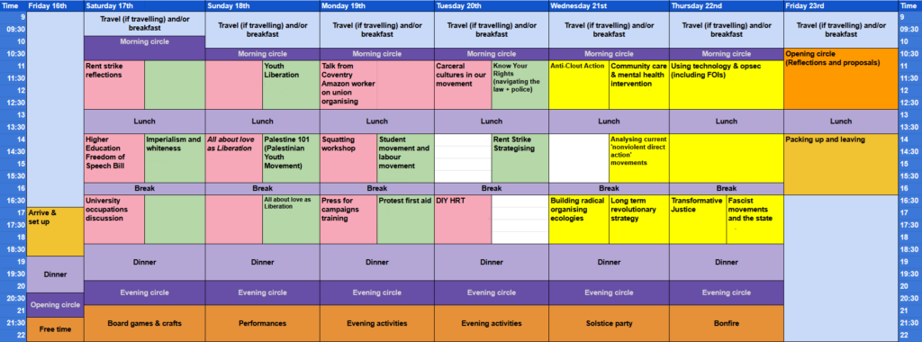 Once again we got around 70 attendees, with a mix of students and non-students, and even some people from outside the UK. Our programme was very strong, covering a range of topics. Interestingly, although not planned, throughout the week we noticed a consistent theme of care cropping up in many discussion, as many participants took the opporunity to chystalise their reflections on local organising. For lots of us, this had been the realisation that prioritising looking after each other is essential for sustainable and strong movements to grow, and it was a relief to find out that lots of other people had been thinking along similar lines – we can and must do better than burnout culture demands!
